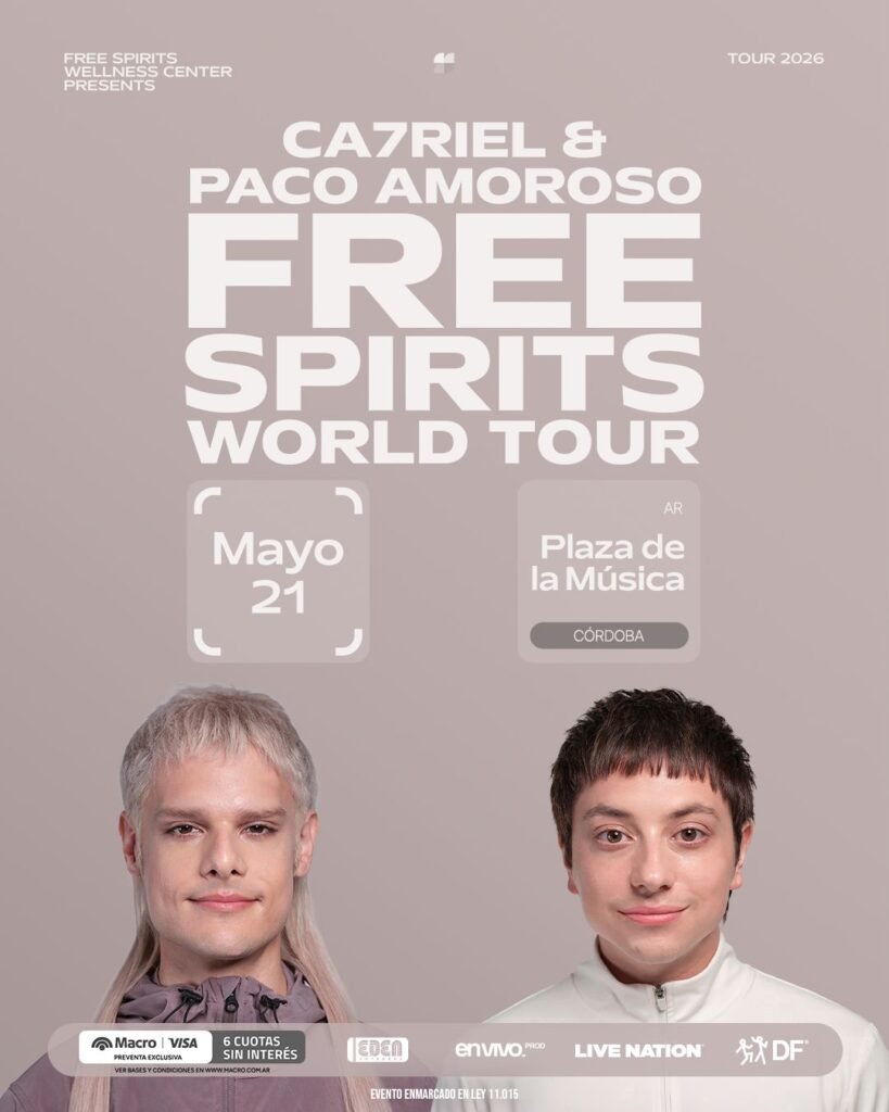 Tras el lanzamiento de su nuevo álbum FREE SPIRITS, CA7RIEL & Paco Amoroso anuncian el FREE SPIRITS World Tour, una imponente gira que recorrerá Latinoamérica, Norteamérica, el Reino Unido y Europa. El tour llevará su explosivo show en vivo a recintos emblemáticos como el Red Rocks Amphitheatre, Radio City Music Hall, The Greek Theatre en Los Ángeles, O2 Academy Brixton en Londres y el Movistar Arena en Madrid, consolidando aún más su ascenso como una potencia global en los escenarios.
